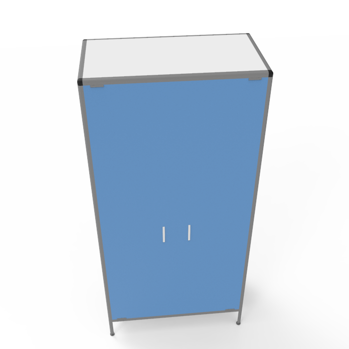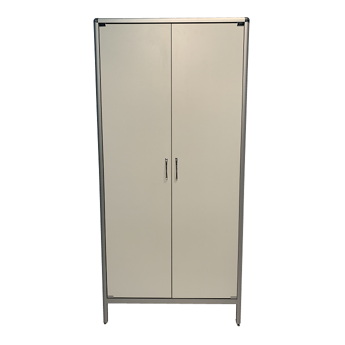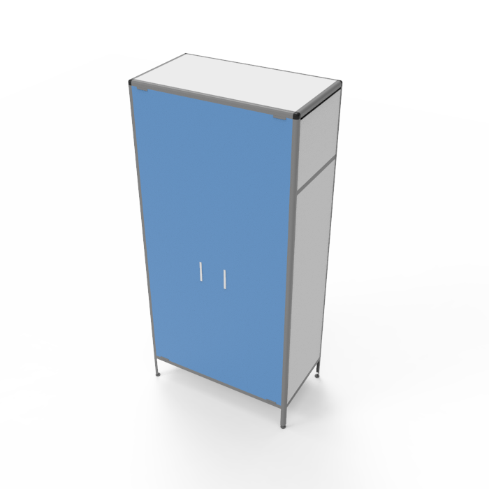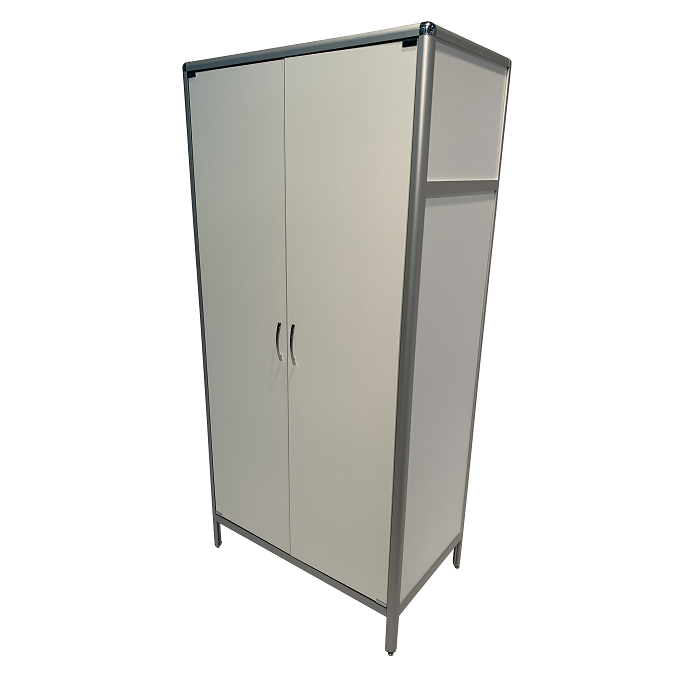 Каркас шкафа выполнен из алюминиевого профиля, что обеспечивает жесткость и прочность конструкции. Порошковое покрытие алюминиевого профиля придает шкафу стильный внешний вид и защищает его от коррозии и внешних воздействий. Регулируемые по высоте ножки позволяют устранить неровности пола и обеспечить устойчивость шкафа на любой поверхности.