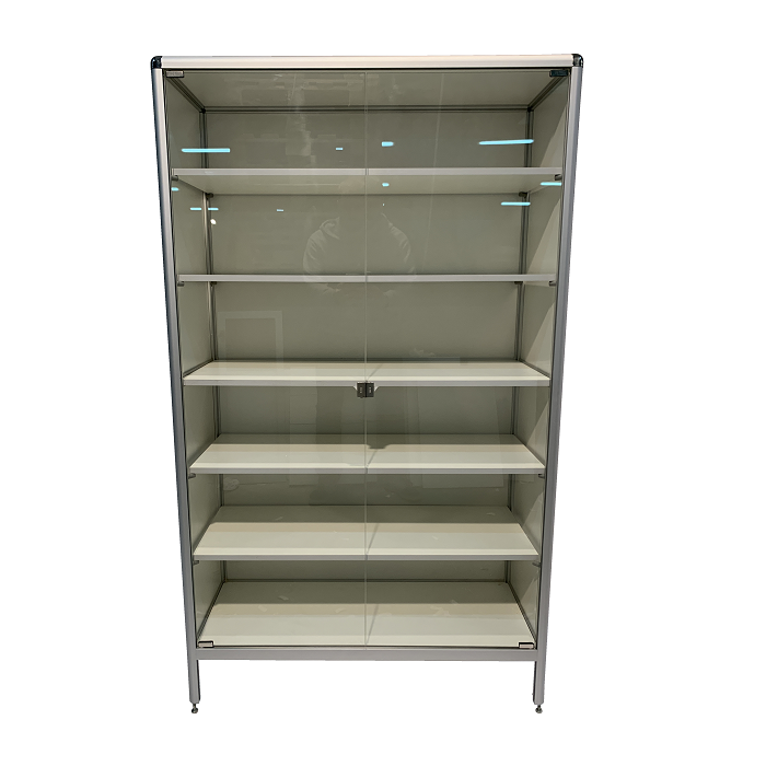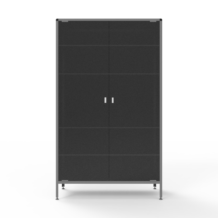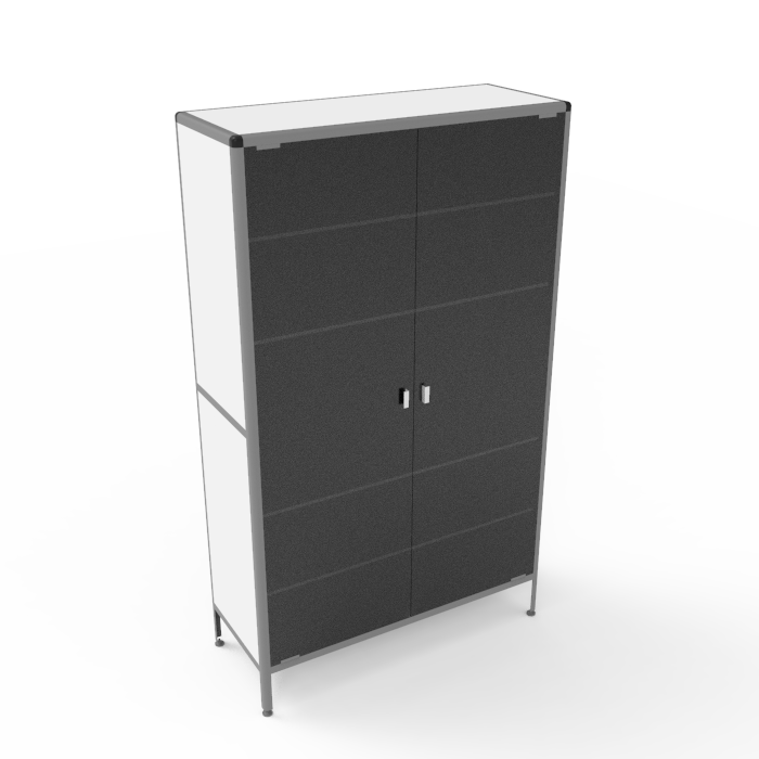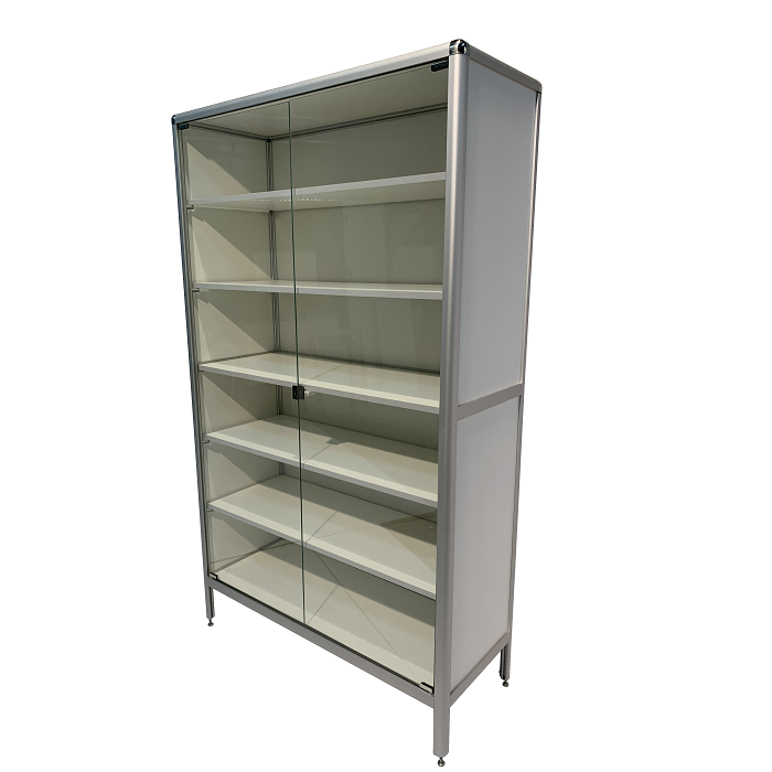 Каркас шкафа из алюминиевого профиля обеспечивает жесткость, устойчивость и прочность всей конструкции, а порошковое покрытие создает эстетичный внешний вид и защищает от внешних воздействий. Наличие регулируемых по высоте ножек позволяет установить шкаф на неровных поверхностях, обеспечивая стабильность. Для удобства организации хранения ниша шкафа разделена на отделения.