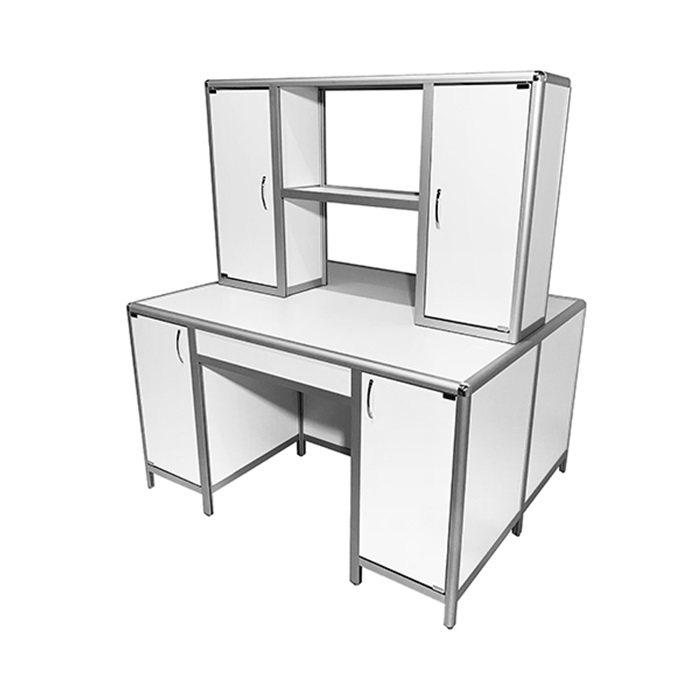 Стол MED 11.003al имеет прочный каркас из алюминиевого профиля, а столешница изготовлена из ЛДСП белого цвета с кромкой светло-серого оттенка, что придает ему современный вид. Размеры рабочей поверхности составляют 1500х1200 мм, а равномерно распределенная нагрузка достигает 25 кг. Тумбы и надстройка оборудованы регулируемыми по высоте опорами для компенсации неровностей пола и обеспечения устойчивости конструкции.