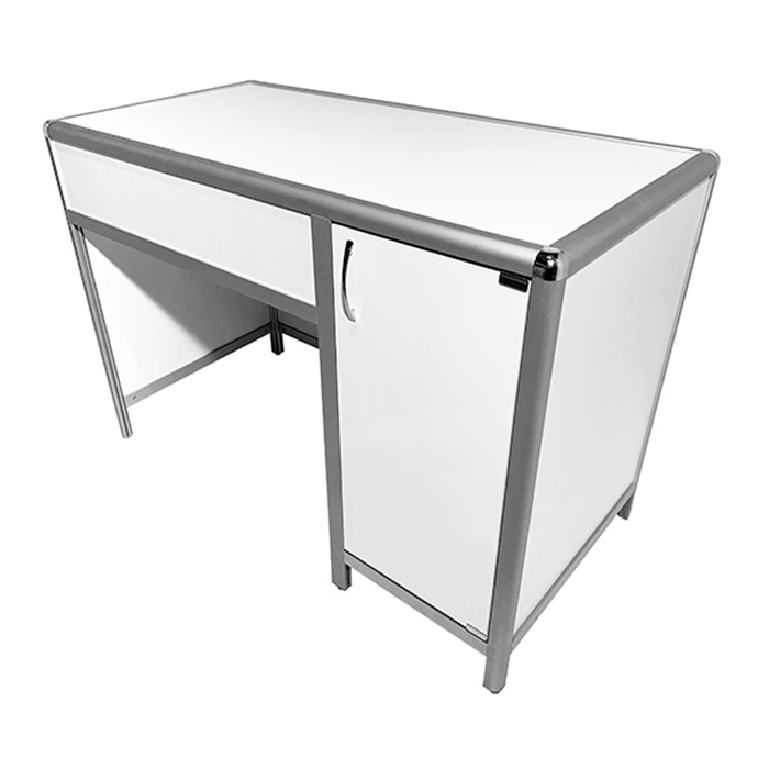 Каркас стола изготовлен из прочного алюминиевого профиля, обеспечивая надежность и стабильность конструкции. Стильное сочетание белого цвета ЛДСП столешницы с кромкой светло-серого оттенка добавляет эстетического шарма и создает современный внешний вид.