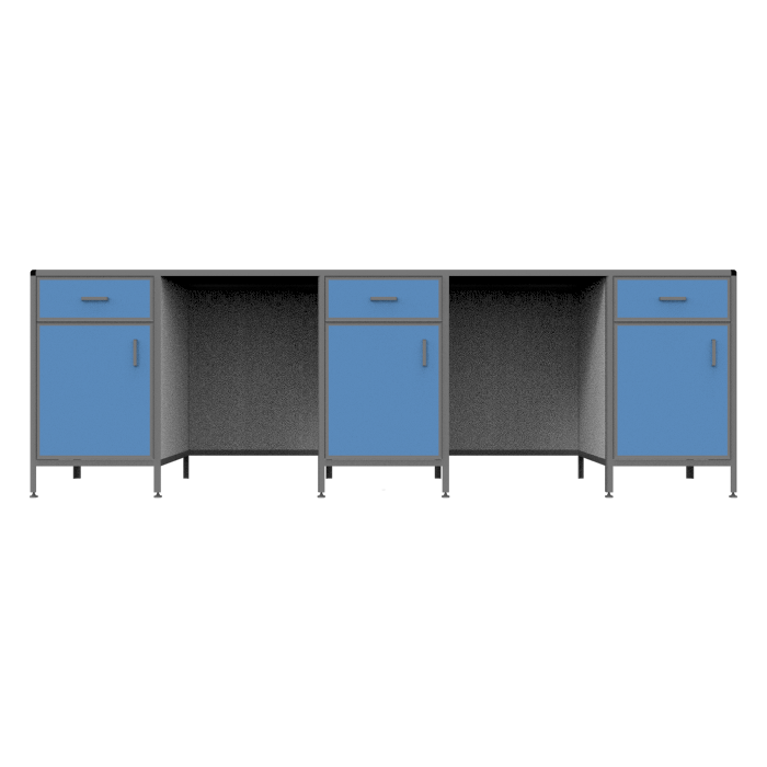 Три тумбы, комплектующие стол, каждая из которых оборудована верхним выдвижным ящиком, отделением с распашной дверкой и полкой внутри, предоставляют дополнительное пространство и удобство хранения различных предметов. Это позволяет сотрудникам легко организовать рабочие материалы и сохранять порядок на рабочем месте.