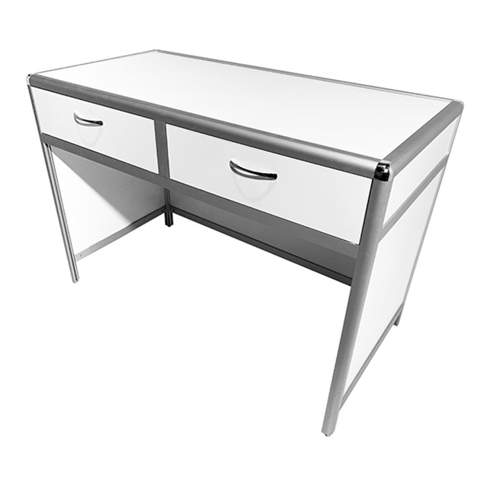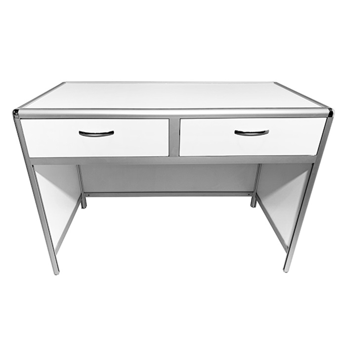Каркас стола изготовлен из алюминиевого профиля с вертикальными стойками 30х30 мм и горизонтальными прогонами 33х20 мм, обеспечивая прочность и устойчивость конструкции. Стильное исполнение столешницы из ЛДСП белого цвета с кромкой светло-серого оттенка придает столу современный вид.
