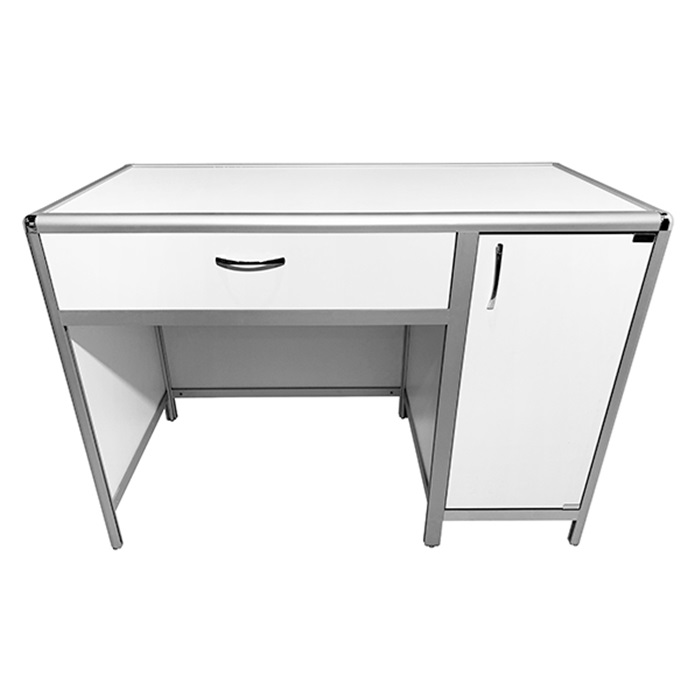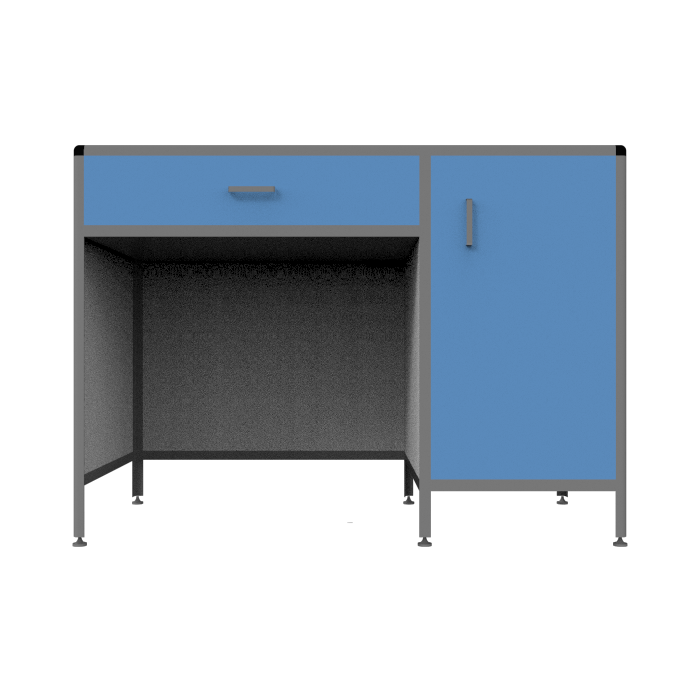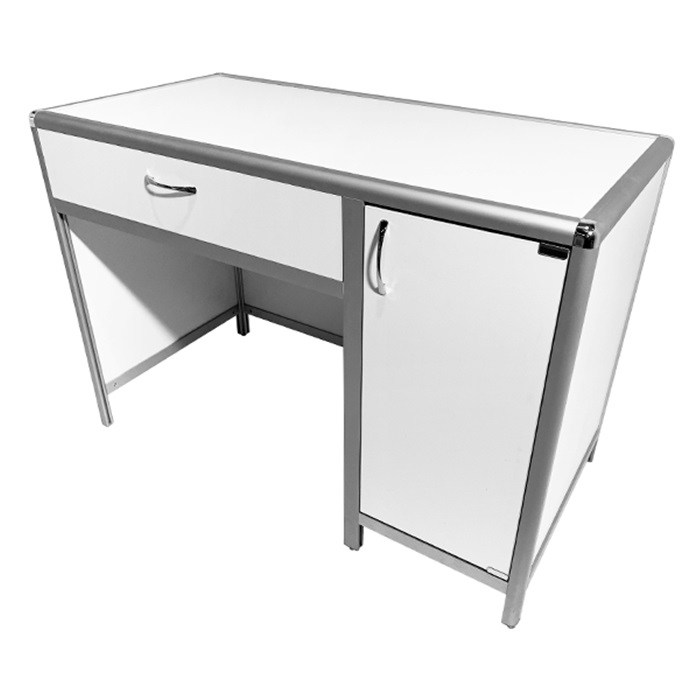 Каркас стола выполнен из высококачественного алюминиевого профиля, обеспечивая прочность и устойчивость конструкции. Отличительной чертой этой модели является наличие выдвижного ящика и боковой тумбы с распашной дверцей и полкой, что обеспечивает дополнительное пространство для хранения необходимых материалов и инструментов.