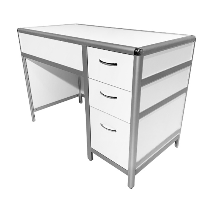 Каркас стола изготовлен из прочного алюминиевого профиля, что обеспечивает надежность и стабильность конструкции. Он сочетает в себе вертикальные стойки размером 30х30 мм и горизонтальные прогоны 33х20 мм. Стильное исполнение столешницы из ЛДСП белого цвета с кромкой светло-серого оттенка придает столу эстетичный внешний вид.