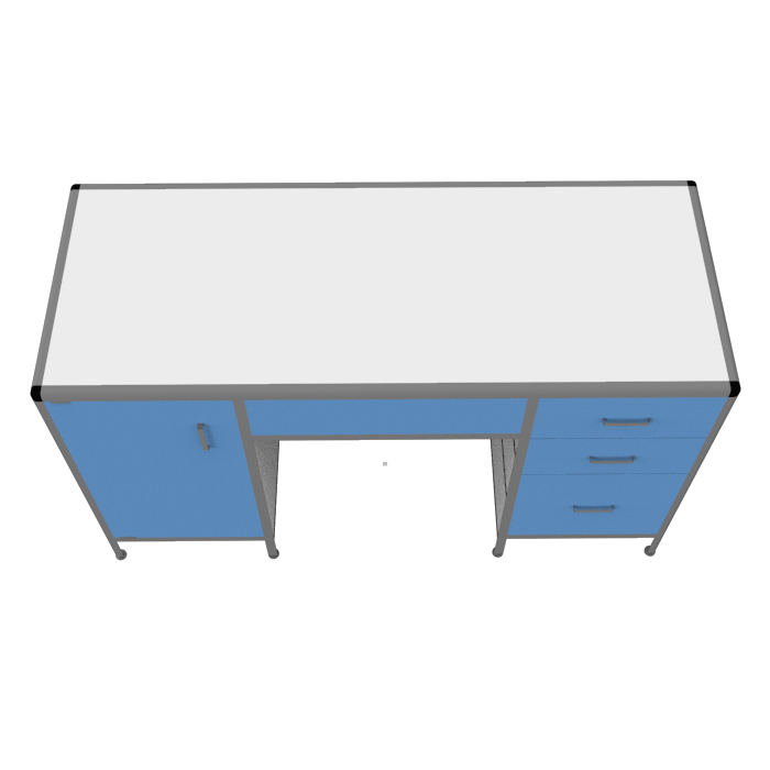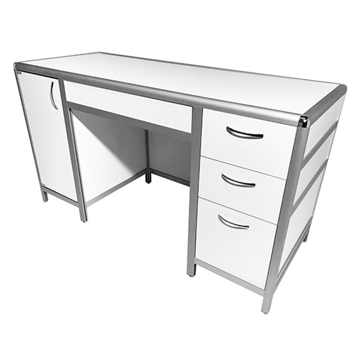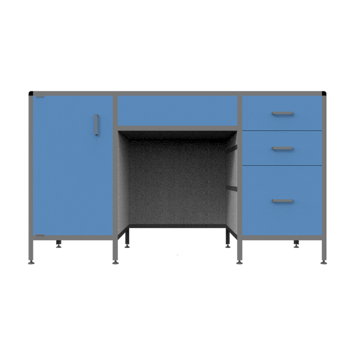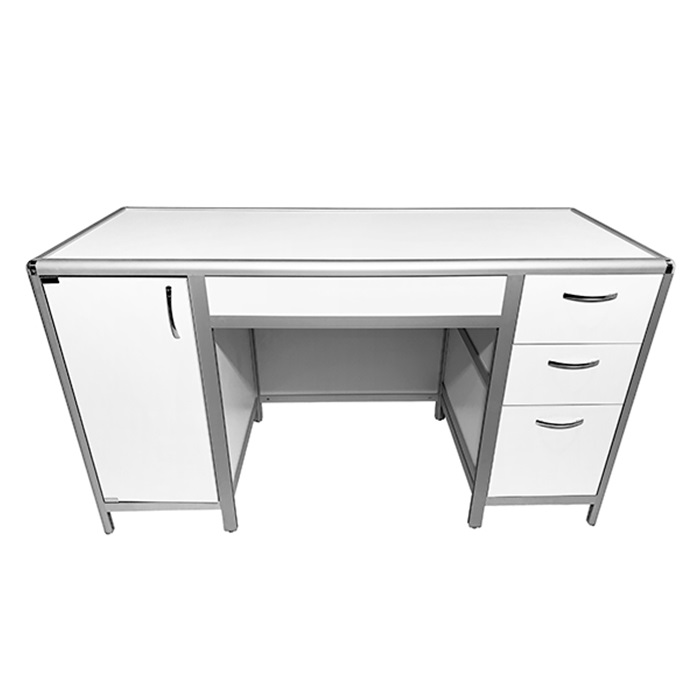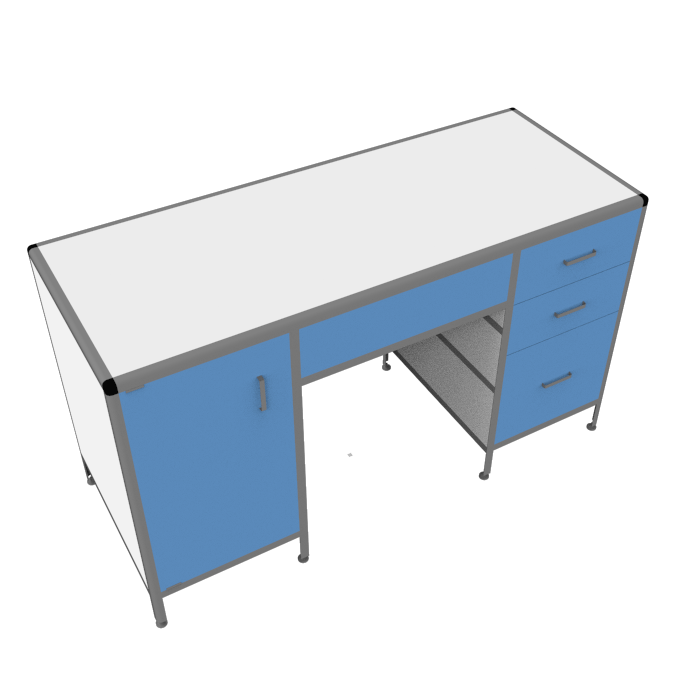 Каркас стола изготовлен из прочного алюминиевого профиля, что обеспечивает прочность и долговечность конструкции. Стол оборудован двумя боковыми тумбами для удобного хранения материалов: справа - тумба с тремя выдвижными ящиками, а слева - тумба с распашной дверкой и полочкой внутри, что значительно увеличивает место для размещения различных предметов.