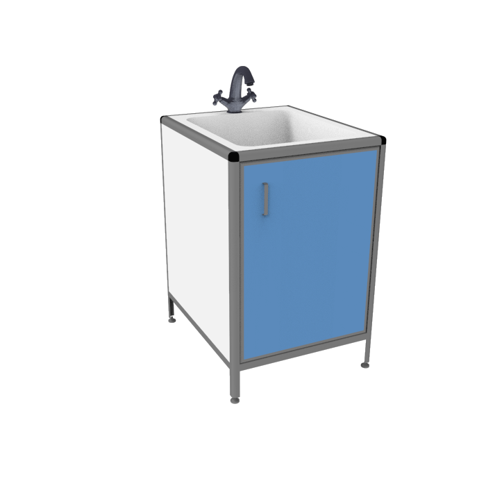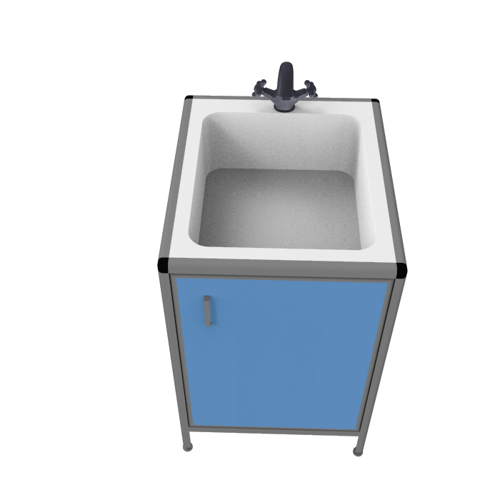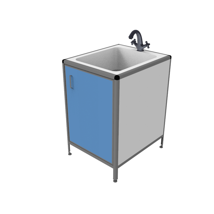 Модель оборудована тумбой под мойкой с удобной дверцей для хранения различного инвентаря. Регулируемые по высоте ножки с винтовыми опорами позволяют легко подстроить стол-мойку под требуемые параметры и установить на неровную поверхность. Чаша с смесителем устанавливается сверху, а каркас из алюминиевого профиля с порошковым покрытием обеспечивает прочность и легкость конструкции.