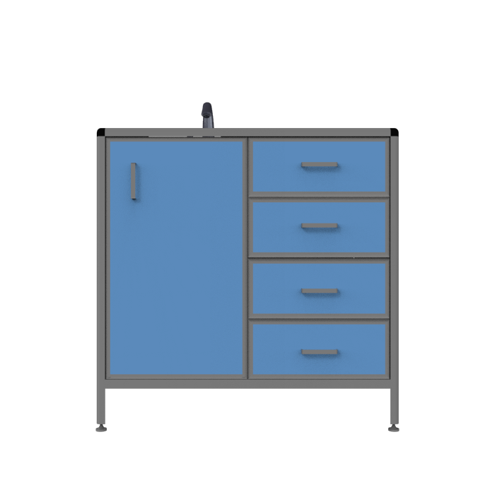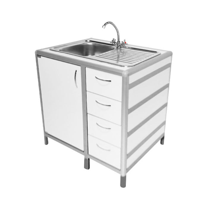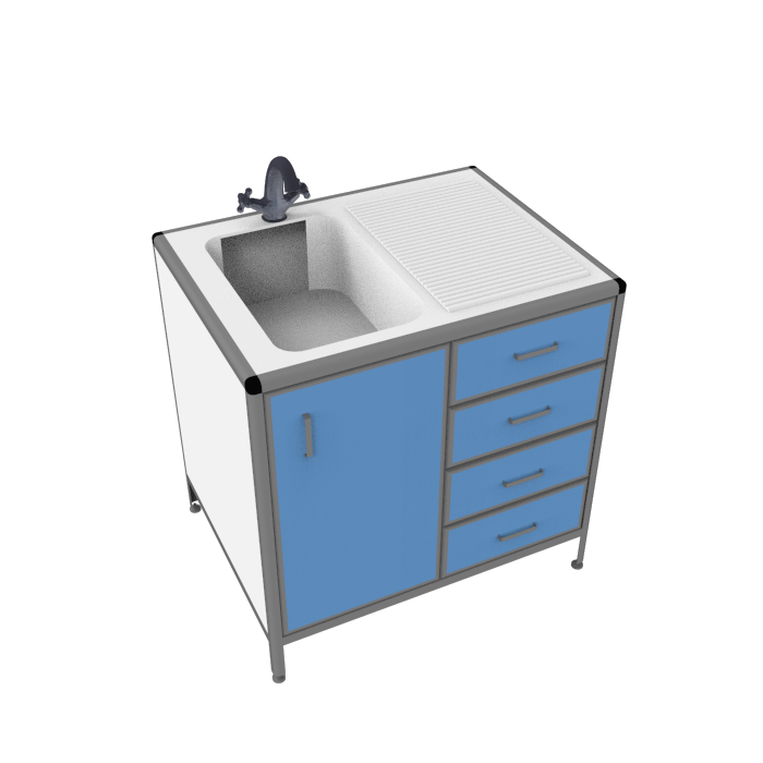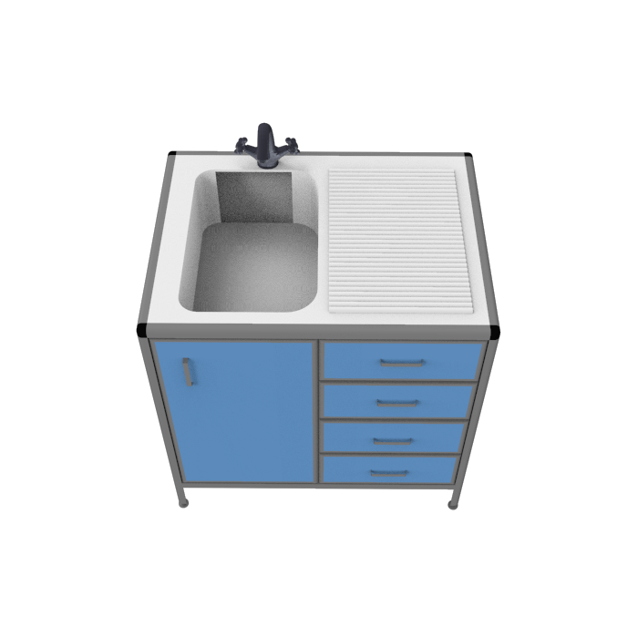 Чаша со смесителем и сушилкой устанавливается на столешницу сверху, что обеспечивает удобство в работе со стерильными материалами и жидкостями. Каркас из алюминиевого профиля, покрытого порошковой краской, обеспечивает прочность и надежность конструкции, а столешница и обшивка изготовлены из ЛДСП для легкости в уходе и долговечности.