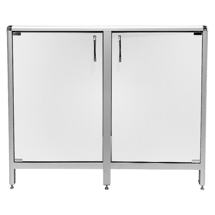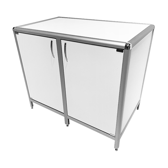 Этот продукт оборудован двумя тумбами с распашными дверками и полками внутри, что обеспечивает удобное хранение и организацию пространства. Каркас стола изготовлен из прочного алюминиевого профиля различных размеров, что обеспечивает стабильность и долгий срок службы. Белый цвет ЛДСП столешницы и светло-серая кромка придают изделию стильный и современный внешний вид.