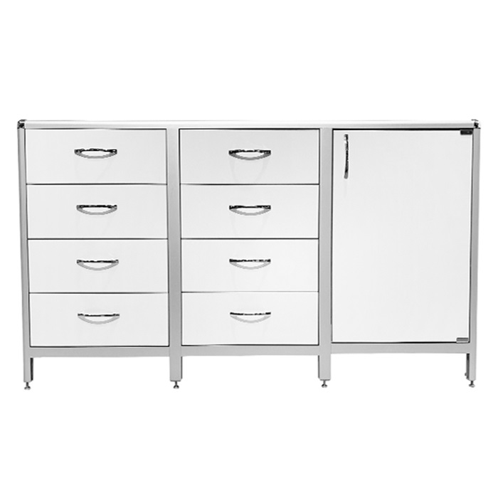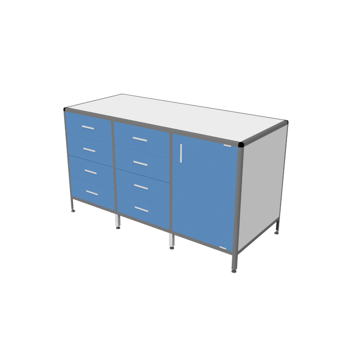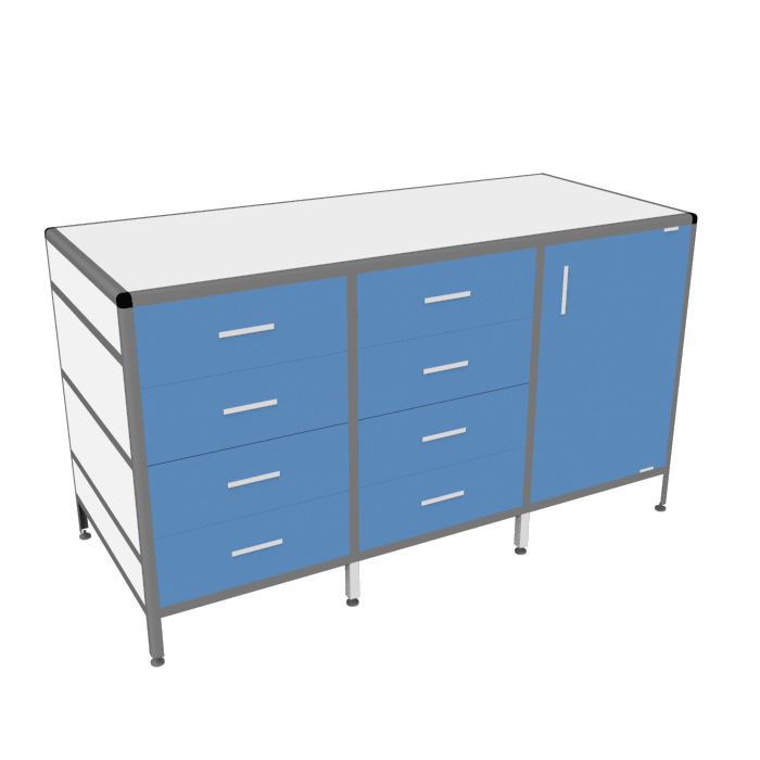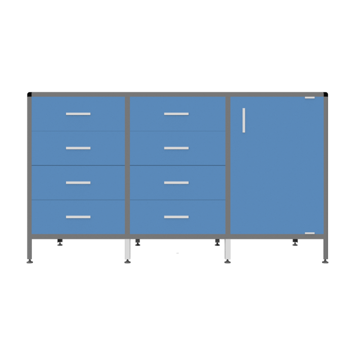 Боковой отдел тумбы оснащен распашной дверкой и полкой внутри, обеспечивая удобное хранение и организацию предметов. Два других отдела оборудованы восемью выдвижными ящиками с внутренним размером 434х70х410 мм каждый, что предоставляет много места для различных инструментов и мелких материалов.