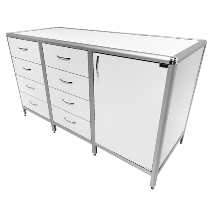 Каркас стола-тумбы MED 12.022al изготовлен из прочного алюминиевого профиля различных размеров, обеспечивая надежность и устойчивость конструкции. Белоснежная столешница из ЛДСП толщиной 16 мм предлагает просторное рабочее пространство размером 1500х600 мм, способное выдерживать равномерно распределенную нагрузку до 25 кг.