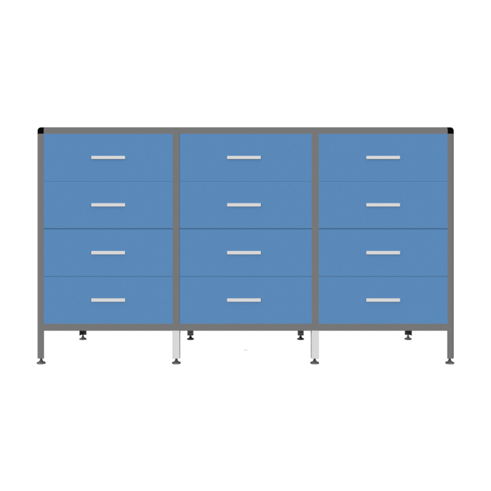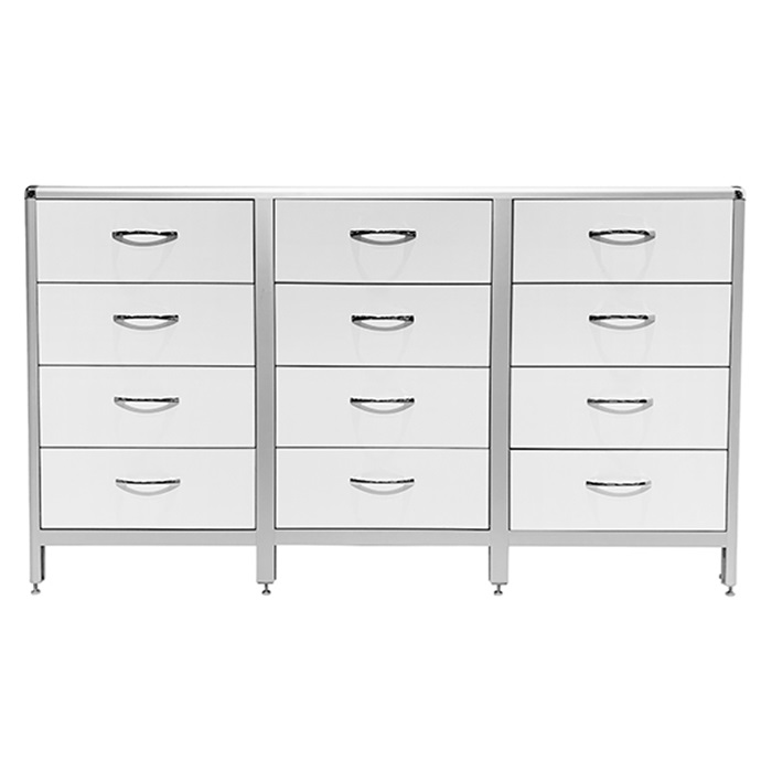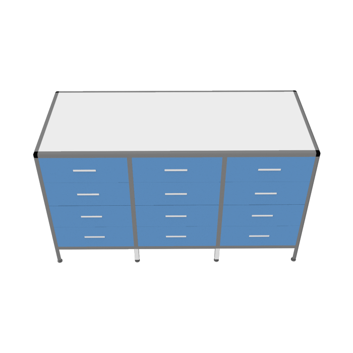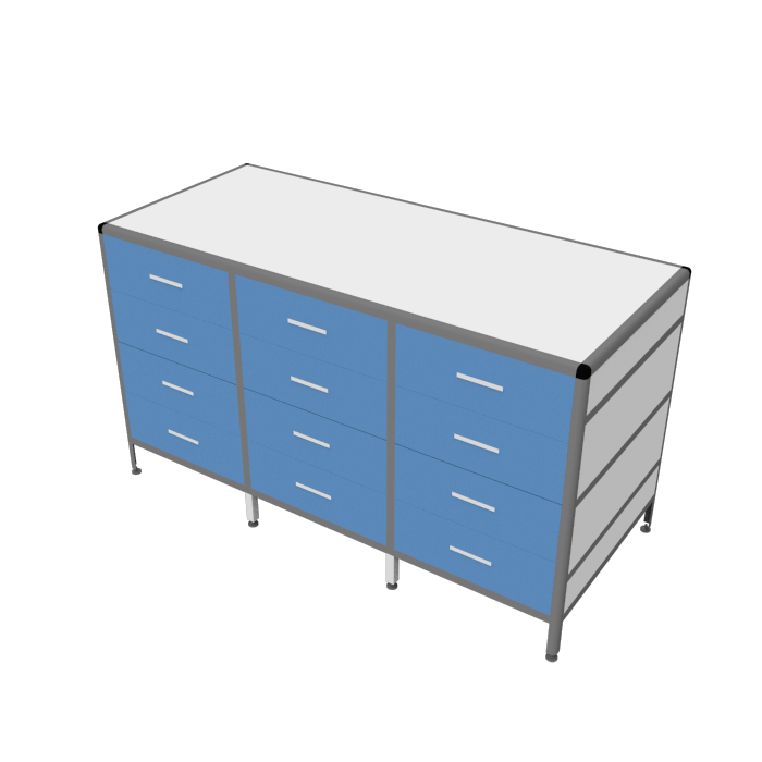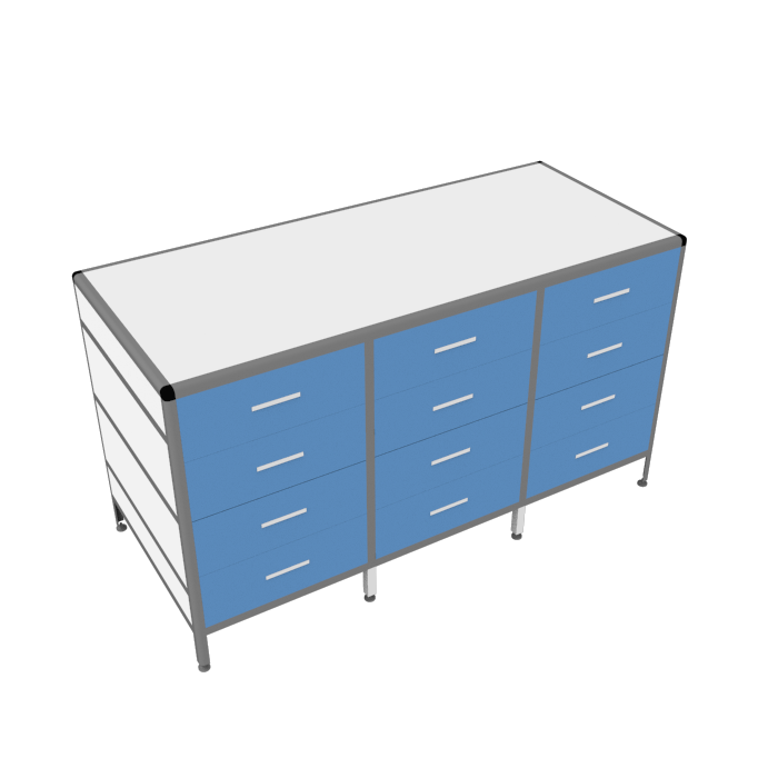 Тумба MED 12.015al разделена на три вертикальные секции, каждая из которых оснащена выдвижными ящиками (всего 12 штук), что обеспечивает удобное хранение и организацию предметов всех размеров. Каркас стола изготовлен из прочного алюминиевого профиля различных размеров, что обеспечивает прочность и надежность конструкции.