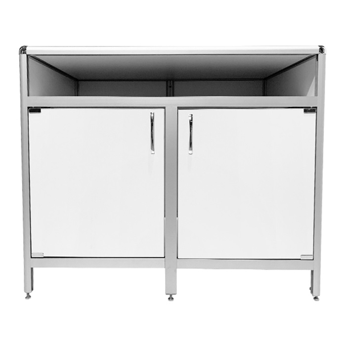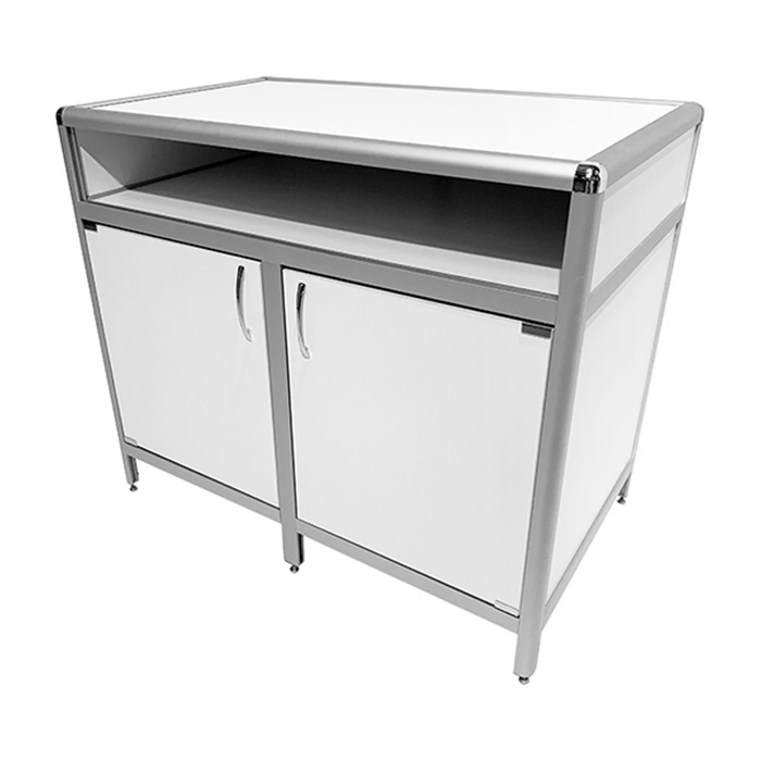 Особенности модели включают прочный каркас из алюминиевого профиля различных размеров, обеспечивающий надежность и устойчивость конструкции. Белый цвет ЛДСП и светло-серая кромка придают столу-тумбе MED 12.009al стильный и современный внешний вид. Рабочая поверхность столешницы из ЛДСП толщиной 16 мм имеет размеры 1000х600 мм, выдерживая равномерно распределенную нагрузку до 25 кг.