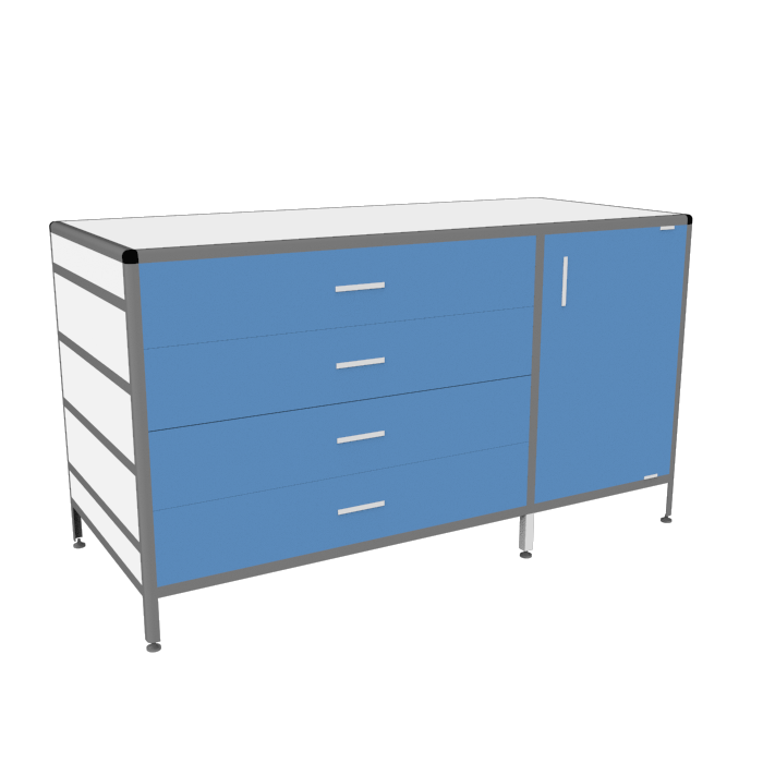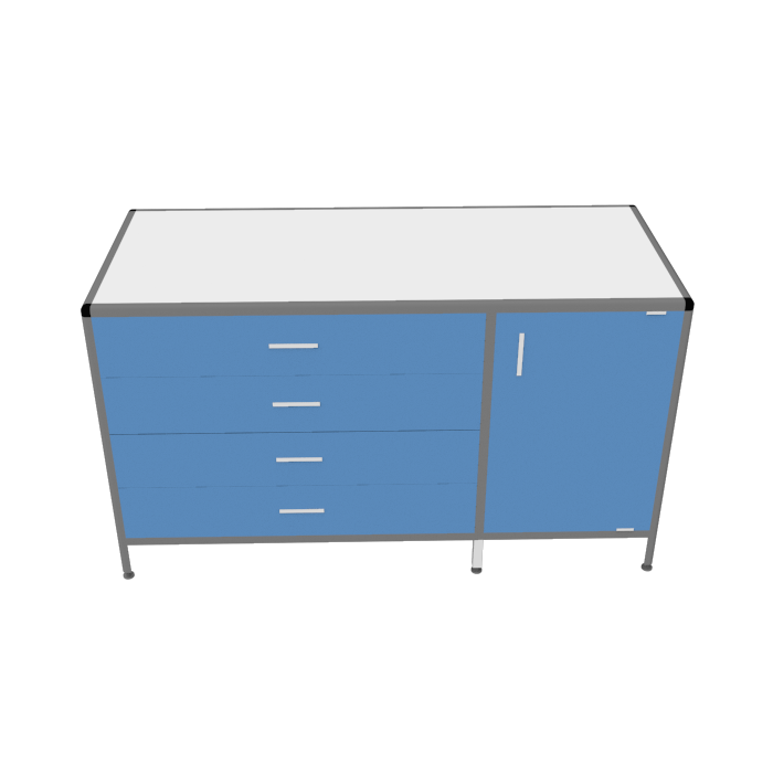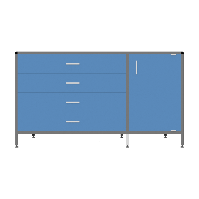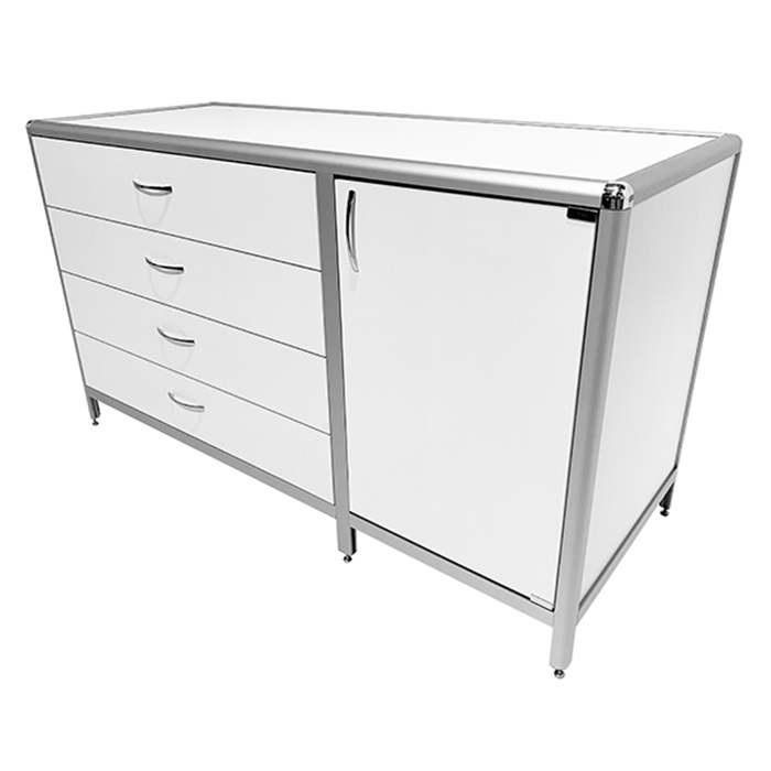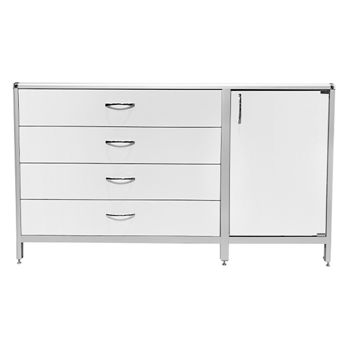 Стол-тумба MED 12.020al оснащена широкими выдвижными ящиками (4 шт.), отделением с распашной дверкой и полкой внутри, что обеспечивает разнообразные варианты хранения и доступа к предметам. Каркас тумбы изготовлен из прочного алюминиевого профиля различных размеров, что обеспечивает надежность и стабильность конструкции.