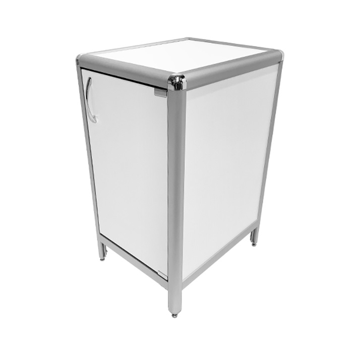 Каркас тумбы MED 16.001al выполнен из алюминиевого профиля различных размеров, что обеспечивает прочность и долговечность конструкции. Белоснежная столешница из ЛДСП толщиной 16 мм с размерами рабочей поверхности 400х500 мм способна выдерживать равномерно распределенную нагрузку до 25 кг.