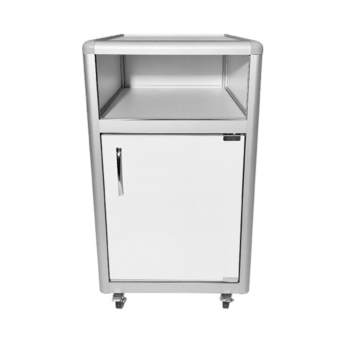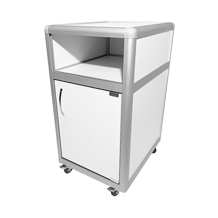 Каркас тумбы изготовлен из прочного алюминиевого профиля, который обеспечивает высокую стабильность и долговечность конструкции. Вертикальные стойки имеют размер 30х30 мм, а горизонтальные прогоны - 33х20 мм. ЛДСП белого цвета с кромкой светло-серого оттенка придает тумбе современный и аккуратный внешний вид, идеально подходящий для медицинских и лабораторных условий.