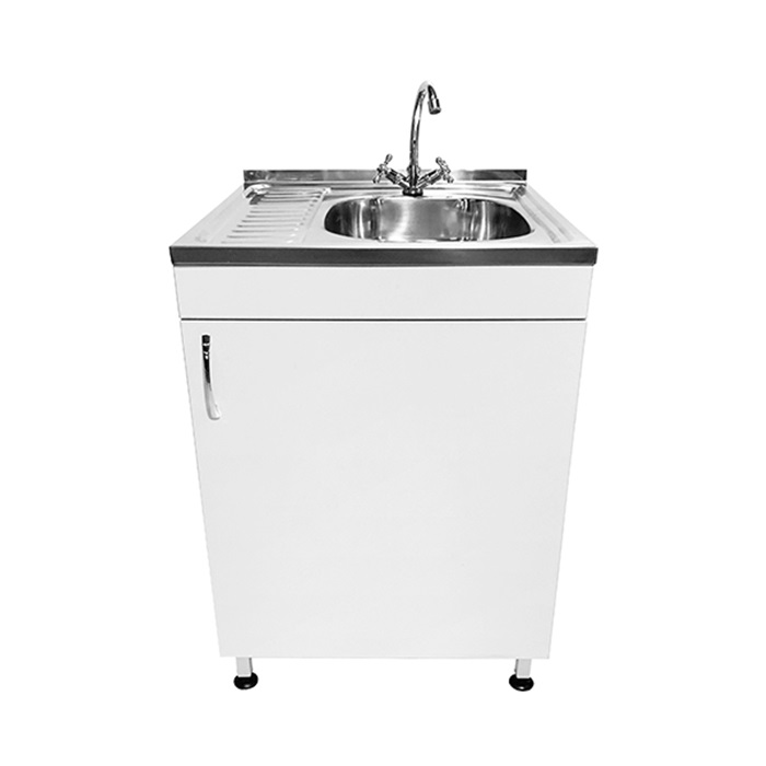 Мойка оснащена тумбой под мойкой с распашной дверцей, что обеспечивает удобный доступ к хранимым материалам. Регулируемые по высоте ножки с винтовыми опорами-регуляторами позволяют установить мойку даже на неровной поверхности, обеспечивая устойчивость и комфорт во время работы. Чаша со смесителем и сушилкой устанавливаются сверху для удобства использования и обслуживания.