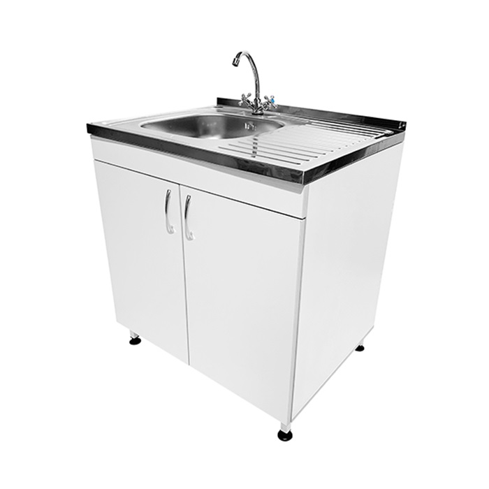 Мойка оборудована тумбой с двумя распашными дверцами, что обеспечивает простое и эффективное хранение необходимых материалов. Регулируемые по высоте ножки с винтовыми опорами-регуляторами позволяют установить мойку даже на неровной поверхности, а чаша со смесителем и сушилкой устанавливаются сверху для удобства использования и обслуживания.