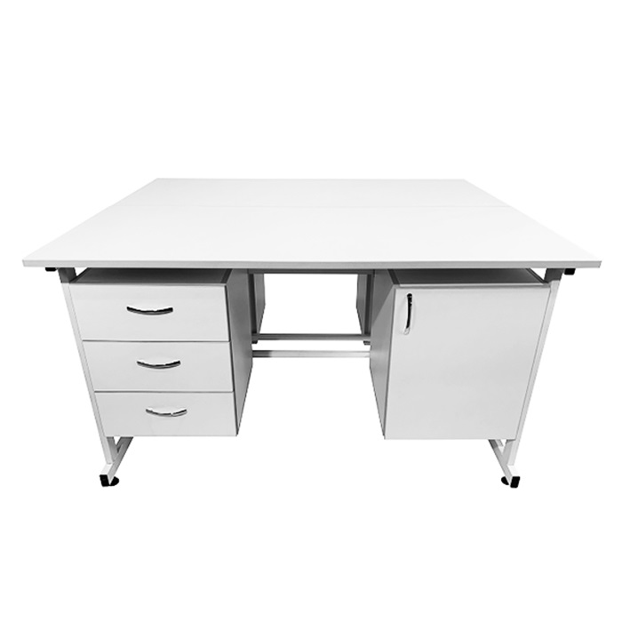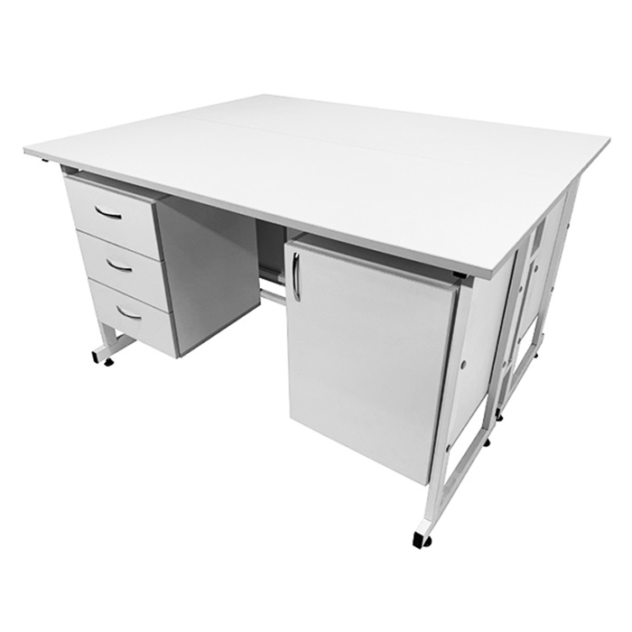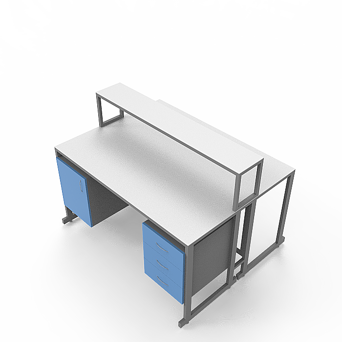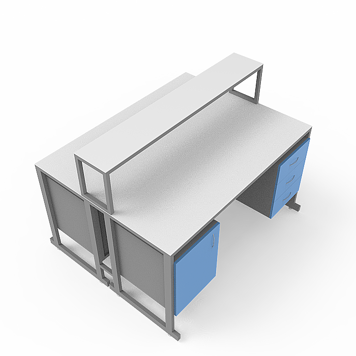 Каждое из рабочих мест стола оборудовано двумя подвесными тумбами, предлагая удобное хранение необходимых материалов. Слева расположена тумба с тремя выдвижными ящиками, а справа - тумба с распашной дверкой и полкой внутри. Это обеспечивает удобство и эргономичность рабочего пространства.