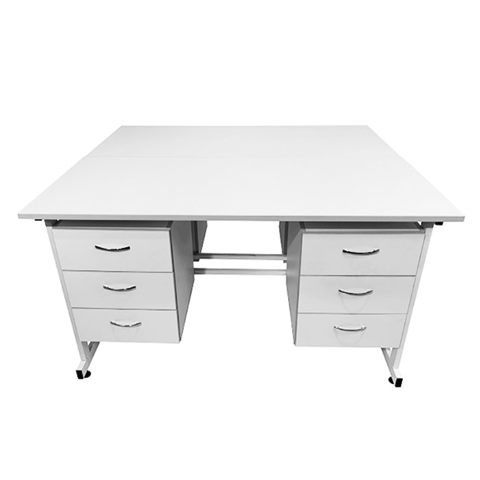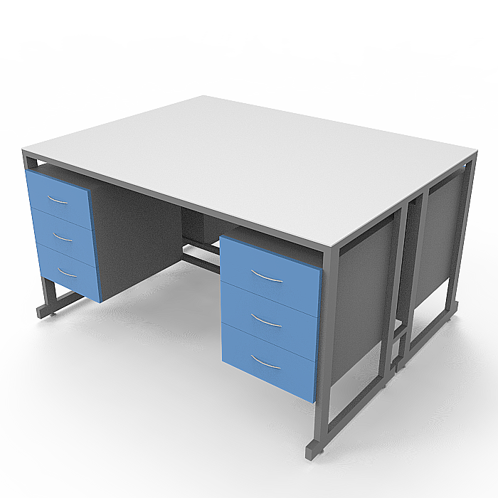 Особенности модели включают в себя прочный каркас из стального профиля, покрытый порошковой краской белого цвета, столешницу из ЛДСП толщиной 22 мм и четыре тумбы с толщиной 16 мм. Стол обладает габаритами 1500х1200 мм и выдерживает равномерно распределенную нагрузку до 60 кг на каждую столешницу.