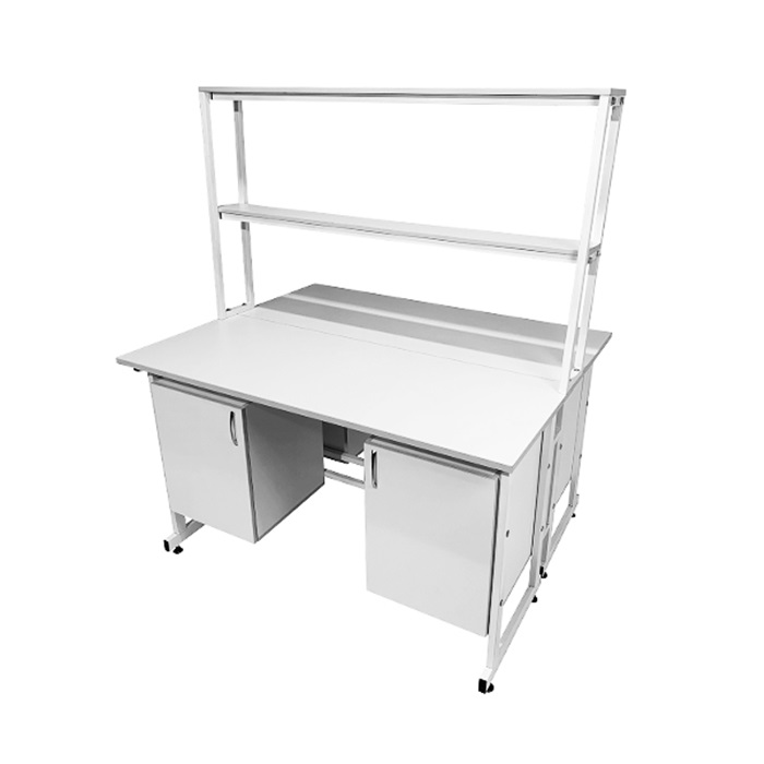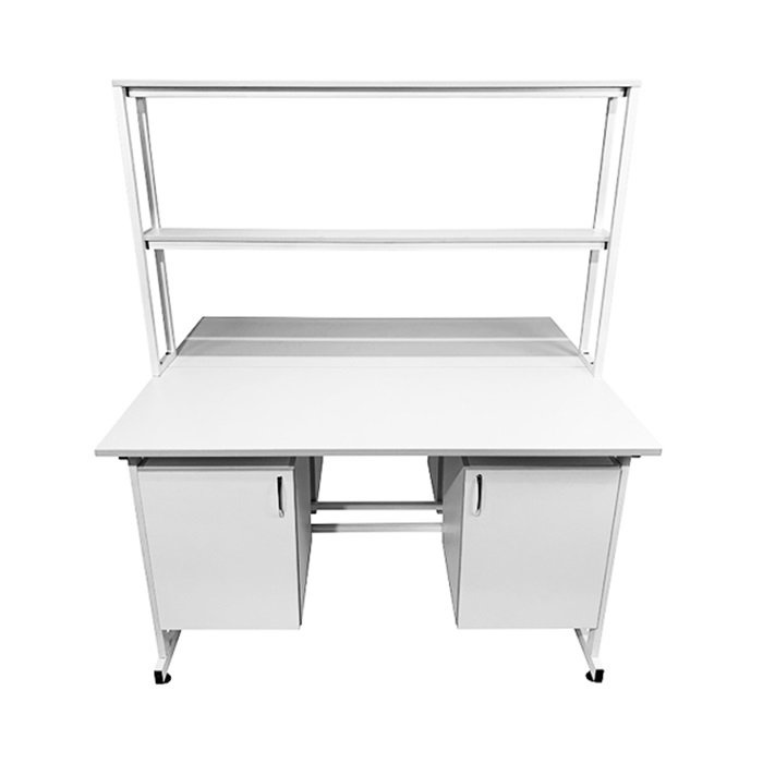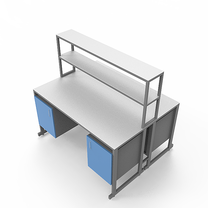 - Тумбы для хранения: Каждое рабочее место оборудовано двумя подвесными тумбами с распашными дверками. Всего четыре тумбы изготовлены из ЛДСП толщиной 16 мм, внутренний размер которых составляет 368x444x428 мм. В каждой тумбе предусмотрена одна полка размером 365x440x16 мм, выдерживающая равномерно распределённую нагрузку до 10 кг. Это обеспечивает значительный объём для хранения различных лабораторных принадлежностей.