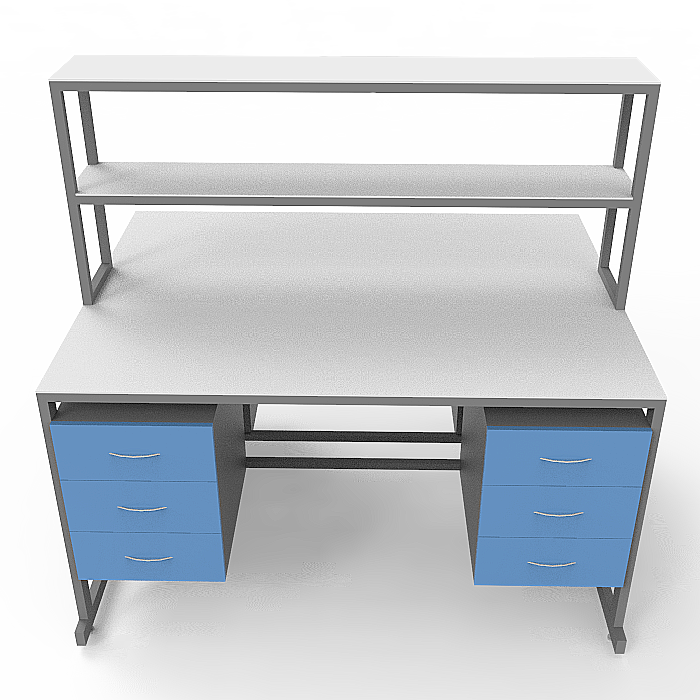 - Столешница: сделана из ЛДСП белого цвета со светло-серой кромкой, толщиной 22 мм. Общий размер рабочей поверхности составляет 1500x1200 мм, состоящей из двух частей размером 1500x600 мм каждая. Равномерно распределенная нагрузка на каждую столешницу – до 60 кг.