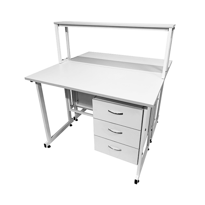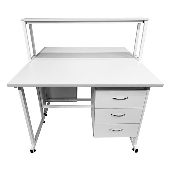 - Конструкция и материалы: Каркас стола изготовлен из прочного стального профиля размером 25х50 мм, покрытого надежной порошковой краской белого цвета. Этот материал обеспечивает долговечность и устойчивость к механическим повреждениям. Основной материал столешницы — ЛДСП белого цвета с кромкой светло-серого оттенка, отвечающей санитарно-гигиеническим требованиям, важным для медицинских учреждений.