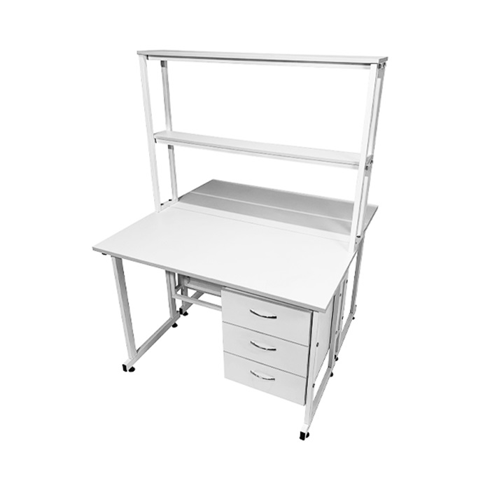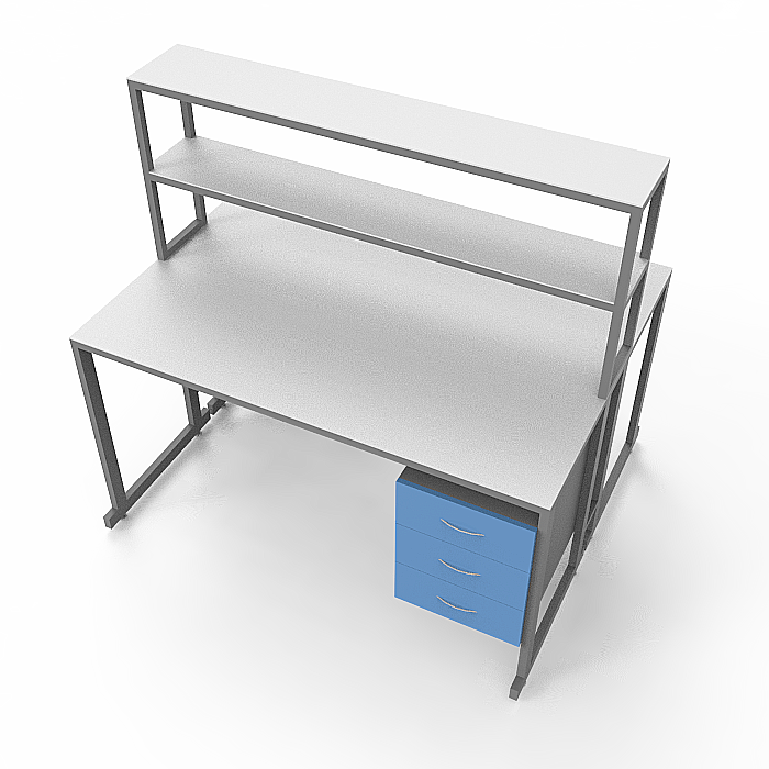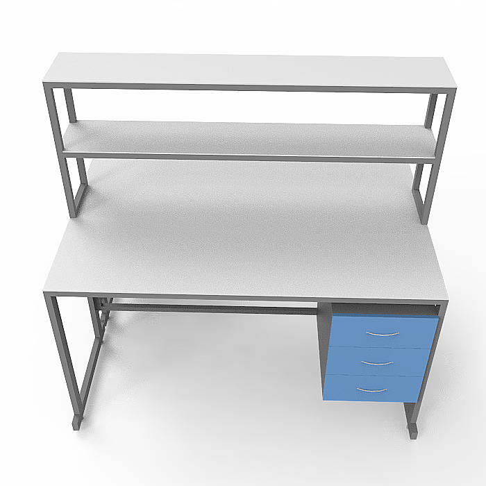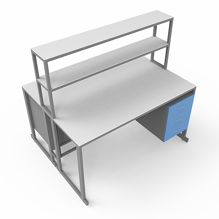 - Надстройка: Посередине столешницы установлена надстройка с двумя полками, что предоставляет дополнительное пространство для размещения лабораторных принадлежностей. Полки из ЛДСП толщиной 16 мм способны выдерживать равномерно распределенную нагрузку до 10 кг каждая. Размер надстройки составляет 1200х250х750 мм, что позволяет удобно разместить необходимые материалы прямо над рабочей поверхностью.