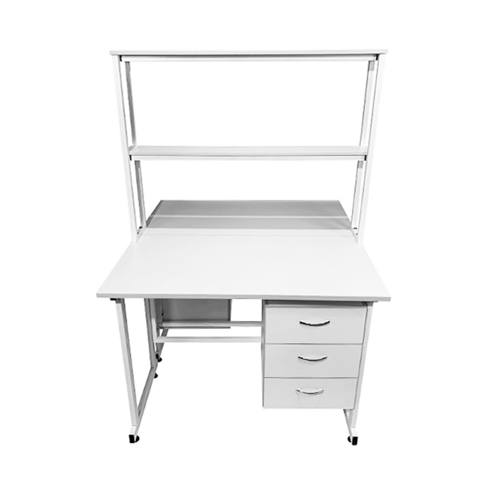 - Столешница: Рабочая поверхность стола состоит из двух столешниц размером 1200х600 мм каждая, что в совокупности дает общий размер 1200х1200 мм. Столешницы изготовлены из ЛДСП белого цвета с светло-серой кромкой, имеют толщину 22 мм и способны выдерживать равномерно распределенную нагрузку до 60 кг. Это делает их идеальными для размещения различного лабораторного оборудования и инструментов.