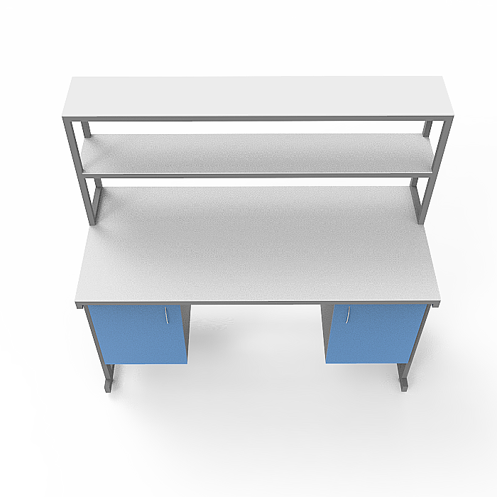 - Подвесные тумбы с распашными дверками и полками внутри расположены по бокам стола, обеспечивая удобное хранение материалов и инструментов.
