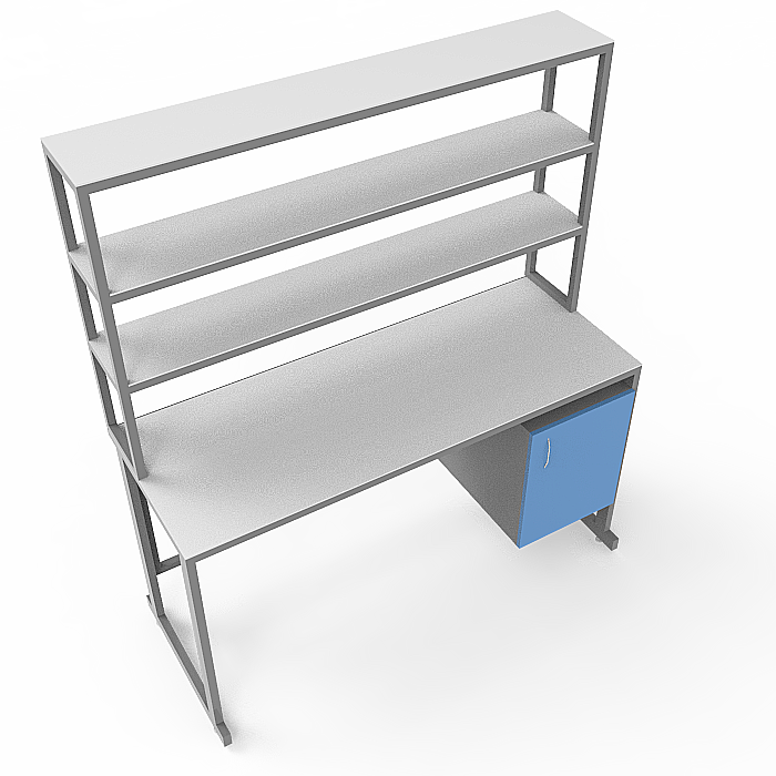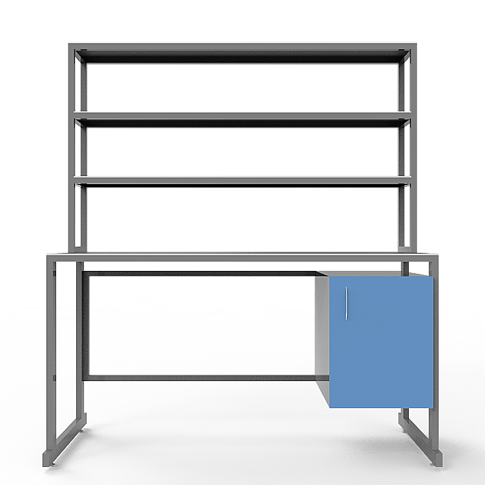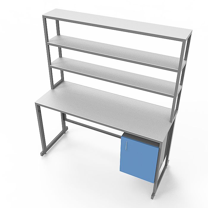 Эта модель стола оснащена удобной надстройкой с тремя полками, позволяющими эффективно организовать рабочее пространство и хранение необходимых материалов. Также в стол встроена тумба с распашной дверцей под столешницей для удобного хранения дополнительных предметов. Регулируемые по высоте ножки обеспечивают стабильность и возможность подстройки высоты стола под индивидуальные потребности.
