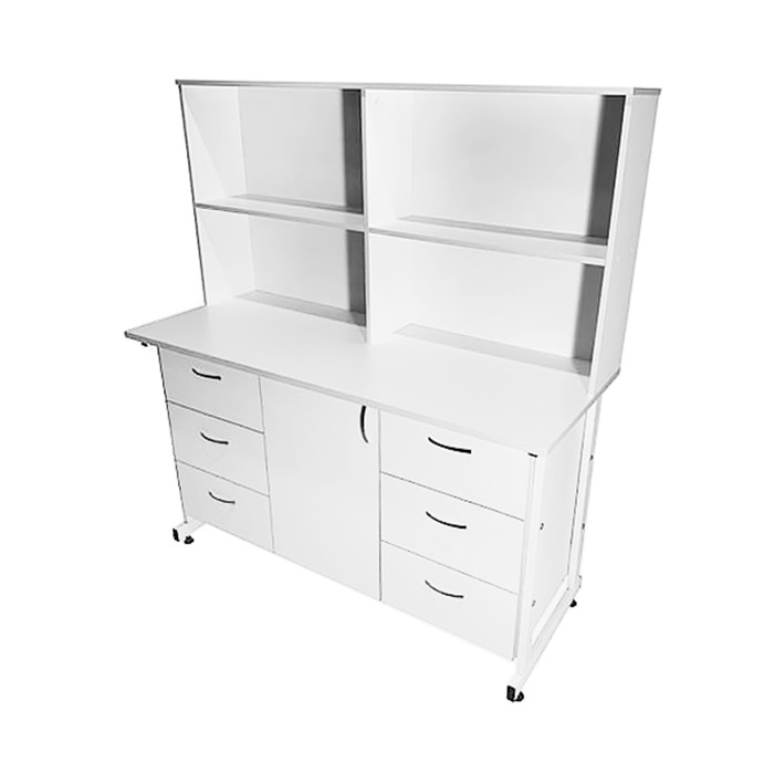 - Под столешницей по бокам размещены шесть выдвижных ящиков (по три с каждой стороны), а по центру - отделение с одной распашной дверкой и полкой внутри, обеспечивая удобное хранение и организацию материалов.