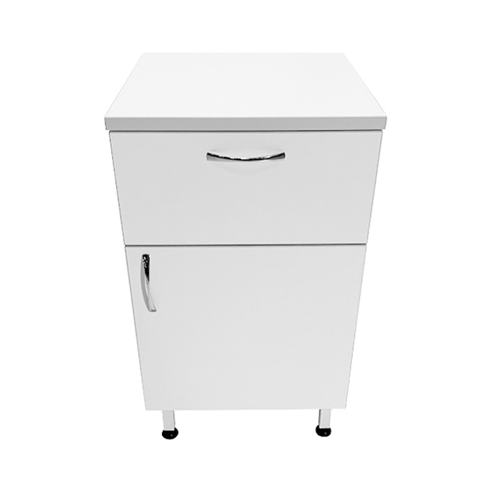 - Тумба оснащена выдвижным ящиком, отделением с распашной дверкой и внутренней полкой для удобного размещения материалов.