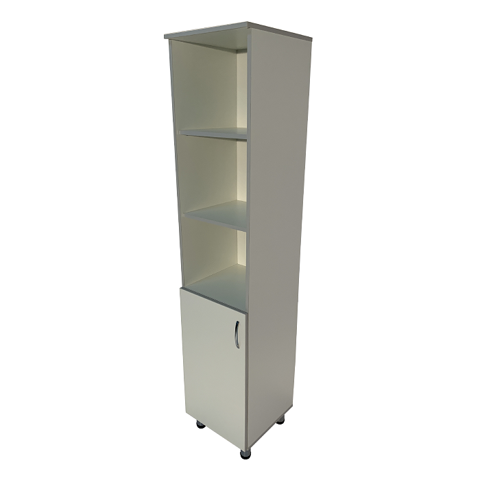 Корпус шкафа выполнен из ЛДСП, что обеспечивает прочность и долговечность конструкции. Шкаф оснащен полками для удобной организации документов, дверцей в нижнем отделе шкафа и регулируемыми по высоте ножками, что облегчает его установку на различных поверхностях. Ниша шкафа разделена на отделения, что упрощает хранение и поиск необходимых материалов.