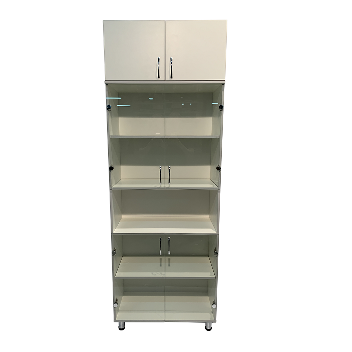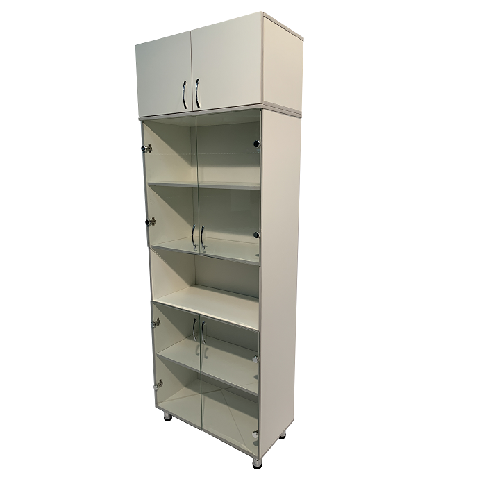 Шкаф оснащен полками, дверцами и регулируемыми по высоте ножками, что делает его удобным и практичным в использовании. Стеклянные средние и нижние дверцы придают шкафу стильный и профессиональный вид, а также позволяют визуально контролировать содержимое ниши.