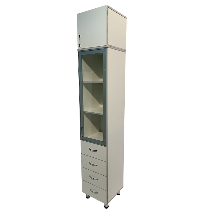 Изготовленный из прочного ЛДСП, данная модель отличается высоким качеством и долговечностью. Средняя дверца шкафа выполнена оригинально из стекла в алюминиевом профиле, что придает изделию стильный и современный вид, делая его функциональным акцентом в интерьере медицинского учреждения.