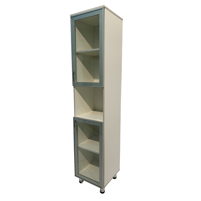 Основные характеристики модели включают в себя удобные полки, дверцы из стекла и регулируемые по высоте ножки. Применение стеклянных дверных вставок в алюминиевом профиле придает шкафу стильный внешний вид и одновременно дополнительно облегчает процесс организации и поиска документации внутри.