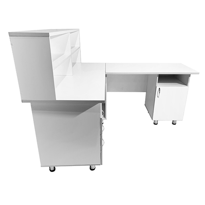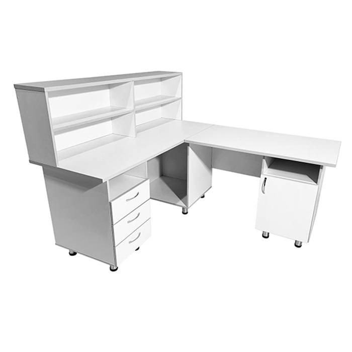 - Ниша и надстройка с полками под столешницей слева, а также тумба с нишей и дверцей под столешницей справа создают дополнительные возможности для организации рабочих материалов и обеспечивают легкий доступ к необходимым предметам.