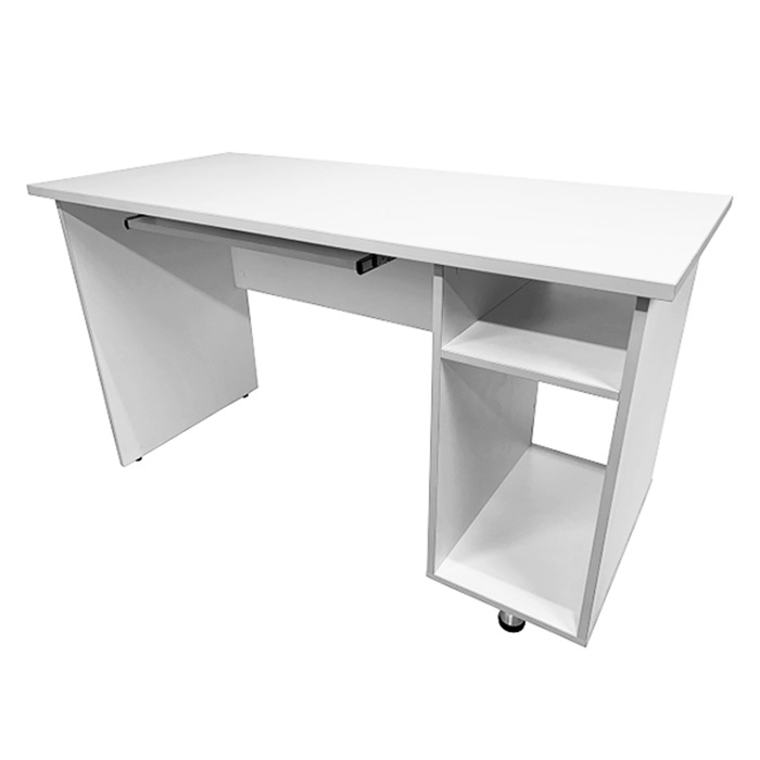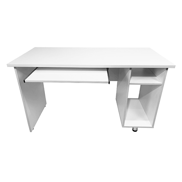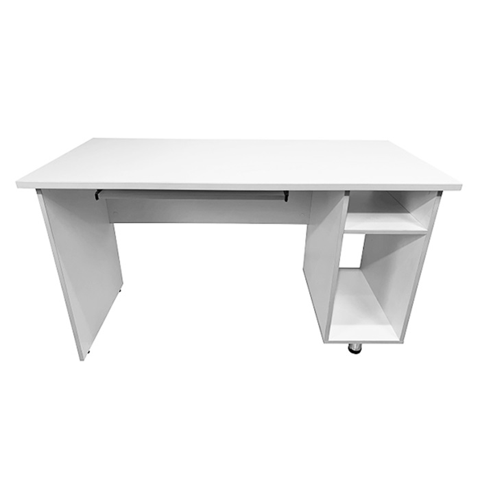 - Под столешницей стола предусмотрена полка для удобного хранения клавиатуры, что помогает освободить рабочее пространство на столе. Боковая тумба оборудована верхней нишей и отделением для системного блока, обеспечивая удобное размещение компьютерного оборудования.