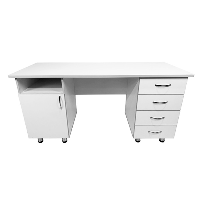 Данный стол оснащен двумя боковыми тумбами: одна из них имеет нишу и отдел с дверкой и полкой внутри, а другая укомплектована четырьмя выдвижными ящиками, обеспечивая удобное размещение и хранение необходимых материалов.