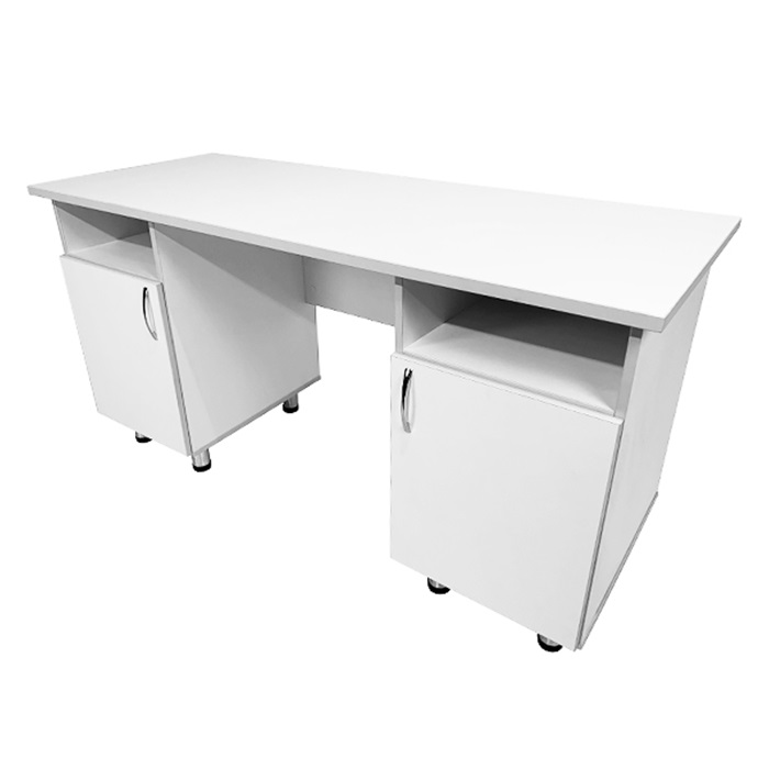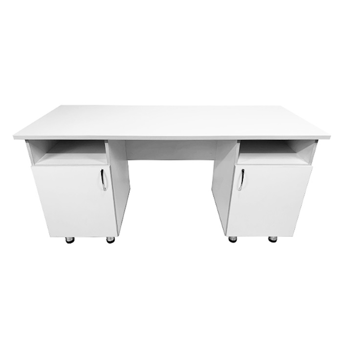 Этот стол оборудован двумя боковыми тумбами, каждая из которых имеет нишу и отдел с дверкой и полкой внутри, обеспечивая удобное хранение необходимых материалов и инструментов. Дизайн выполнен в белом цвете ЛДСП с кромкой светло-серого оттенка, придавая изделию современный и профессиональный вид.