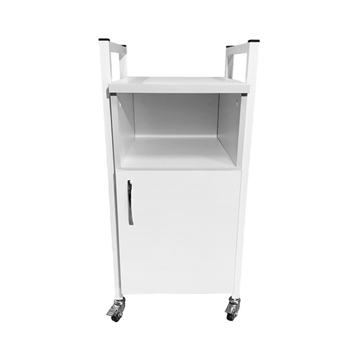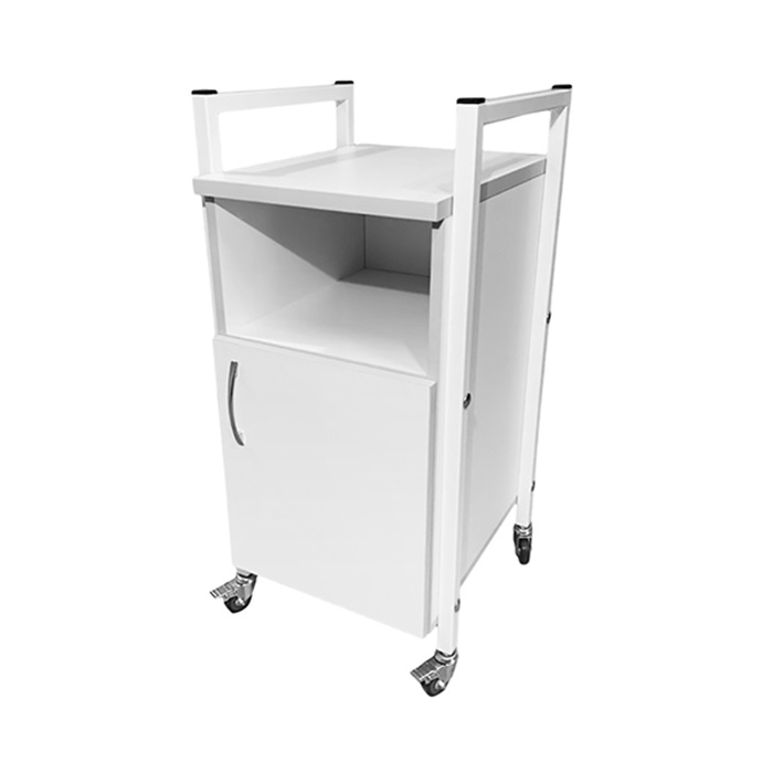 Каркас тумбы выполнен из стального металлокаркаса, покрытого порошковой краской белого цвета, что обеспечивает прочность и долговечность конструкции. Для производства тумбы используется ЛДСП толщиной 16 мм, а столешница выполнена из ЛДСП толщиной 22 мм, обеспечивая устойчивость к повреждениям и легкость в уходе. Внутри тумбы есть ниша и отдел с дверкой, что позволяет удобно хранить медицинские принадлежности и другие необходимые предметы.